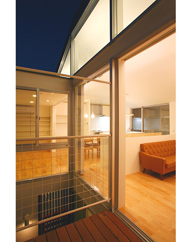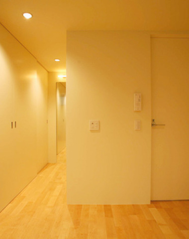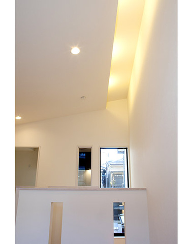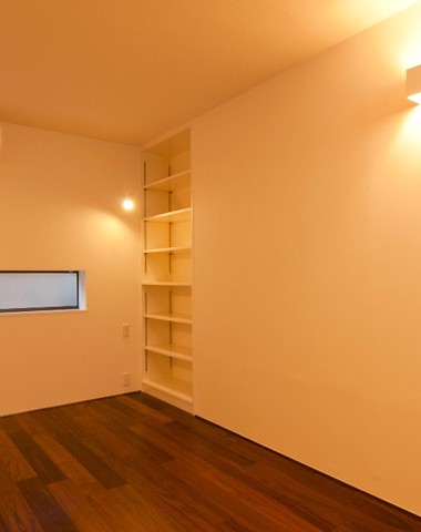 スリットのような細長い小窓と間接照明が美...