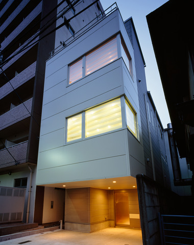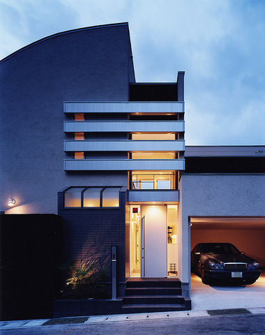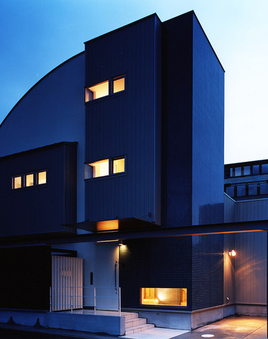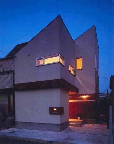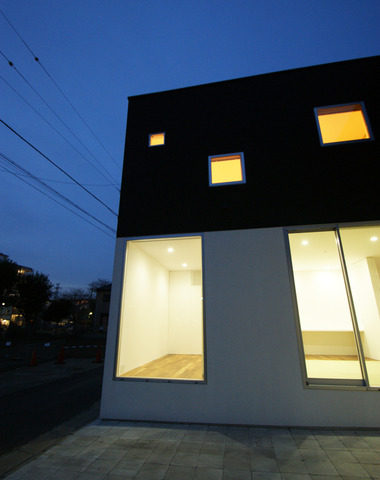 家自体が照明器具のような、大小の窓から見...
