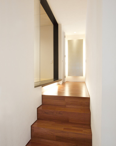 階段先には、ラグジュアリーな間接照明の光...