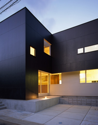 グレーの外壁が闇を作り、窓からこぼれ出る...