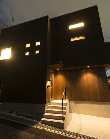 深みのある色合いの木外壁とダウンライトが...