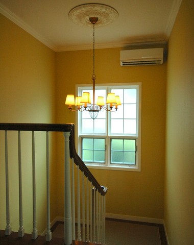 天井部分の細工も美しい階段ホールのシャン...
