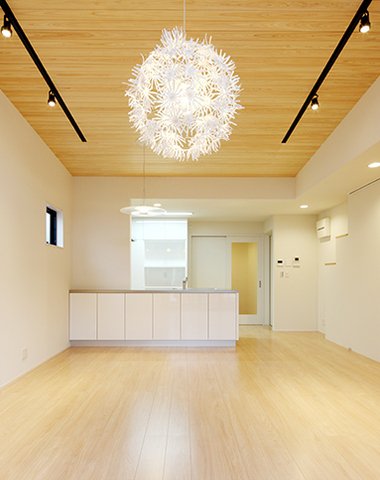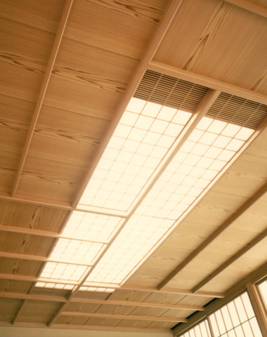 天井は障子の様な照明で器具の存在感を感じ...