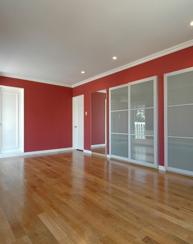 鮮やかな赤い壁紙に白い建具と色のバランス...