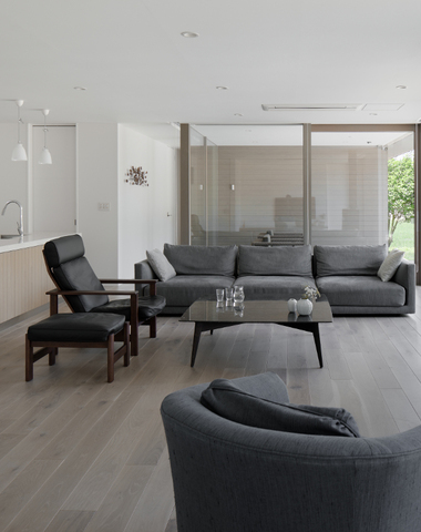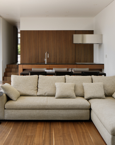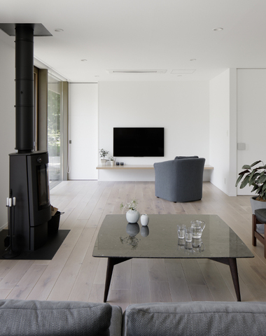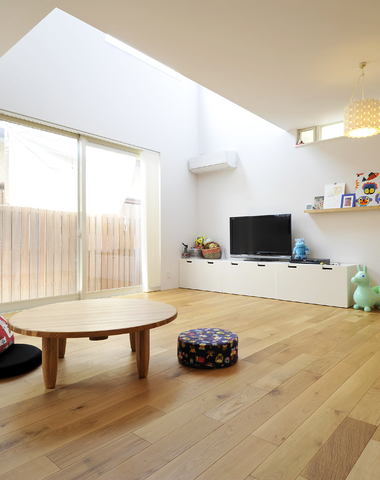 ウォールナットと白い壁でまとめたリビング...