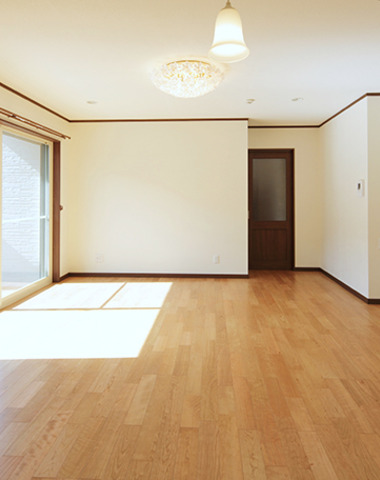 室内の床とテラスに段差がなく、大きな開口部からたくさん光が注がれる明るいリビング。
