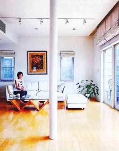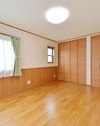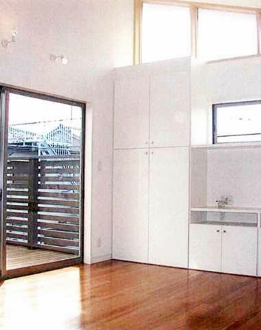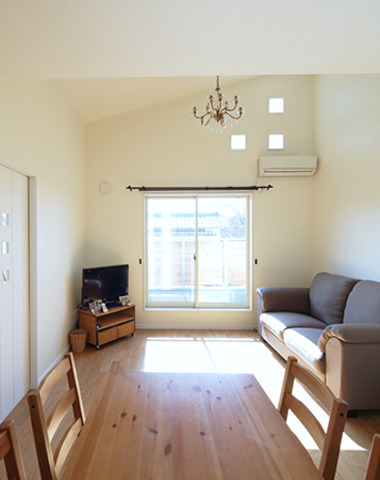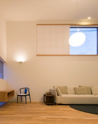 ハイサイド窓と白い壁面収納のスッキリしたリビング。