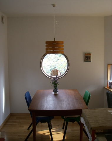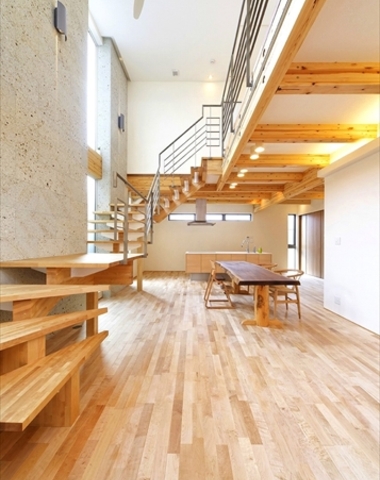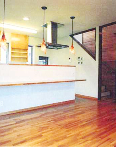 壁の三角形FIX硝子は階段から降りてくる時にリビングの様子を伺えます。 趣あるペンダントライト下のカウンターはカフェやバー空間としても利用できます。