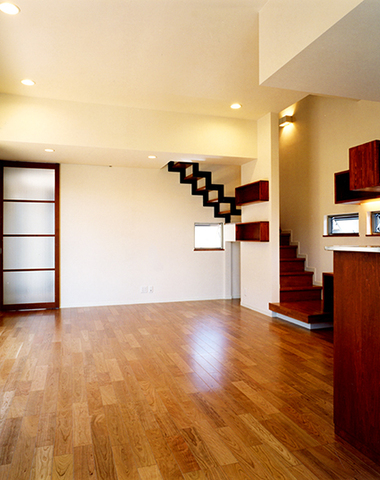 階段からリビングを見下ろす