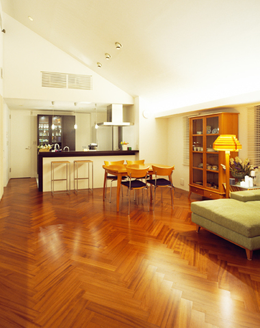 フローリング模様が印象的なリビンク...