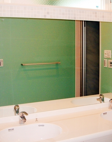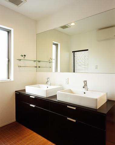 横長に大きな一枚鏡と洗面ボールを2つ設置...