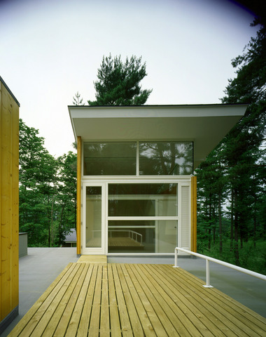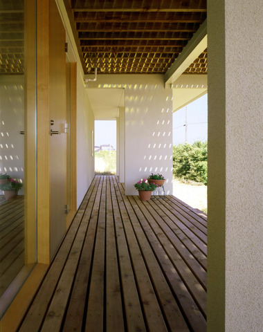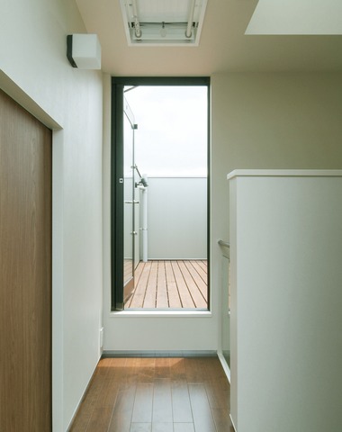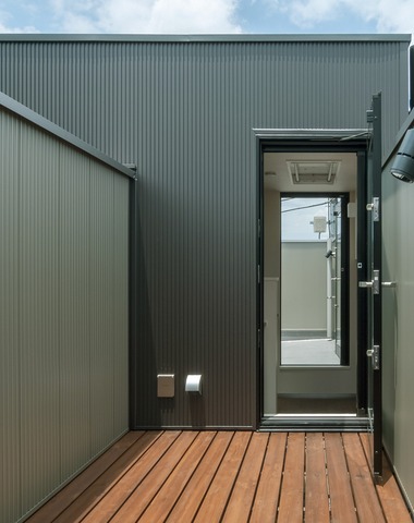 直線が美しい玄関脇のデッキ