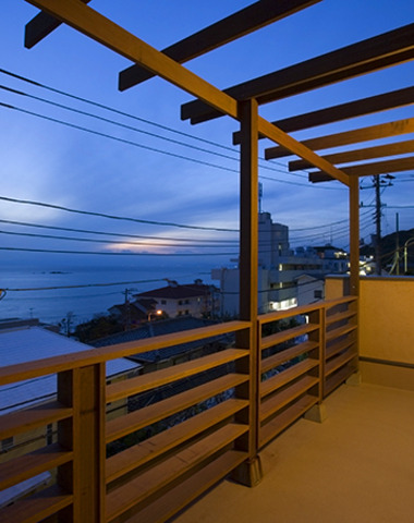 バルコニーから海を眺める