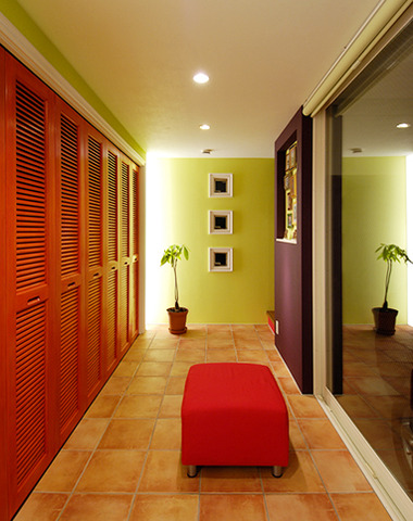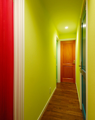 ビビットなグリーンが目を惹く廊下...