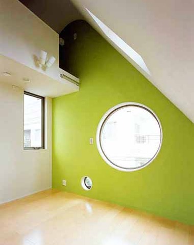 丸い窓とグリーンの壁が印象的な部屋