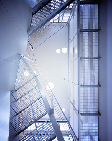 色々な仕上げが交差する中央階段