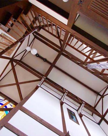 玄関吹き抜け部の天井とステンドグラス