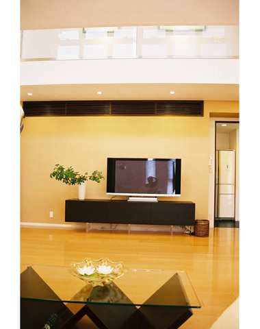 家具と同じ壁仕上げで横のラインを強調
