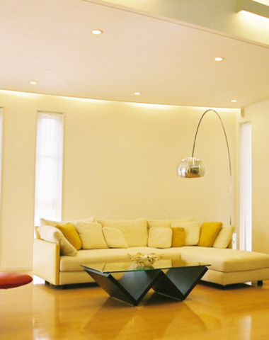 Rの壁を天井の間接照明で照らし形を際立た...