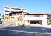 私の自宅兼事務所です。向かって右が事務所、左が自宅。 扇形で、高低差のある敷地の中、長方形平面の事務所と五角形の自宅をスキップフロアでつなぎ、ほぼ天井を張らずに天竜杉の構造材を表しています。
