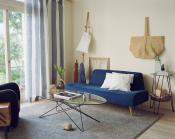 鮮やかなブルーの低くゆったりしたソファに、ブルー×ホワイトのストライプカーテンを合わせた、涼しげな青のコーディネート。ガラストップのローテーブルと、サイドテーブルの一筆書きの様な脚が、リビングに軽やかさ演出しています。ざっくりナチュラルな雰囲気の小物や雑貨を加えて、心地よい風が吹き抜ける爽やかなリビングに。 Photo:Satoko Imazu