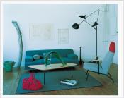 赤の差し色でカジュアルさを演出した、シックモダンなインテリア。変形三角のローテーブルの天板に、程よい緊張感を持ったラウンジチェアの肘掛けの木肌を揃えて、ナチュラルで重すぎない雰囲気に。ローテーブルやラウンジチェアの脚、フロアランプのブラックフレームが、空間のトーンを引き締めています。 Photo:Masahiro Sanbe