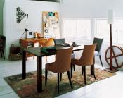 床壁天井の白い空間に、シックでエレガントなダイニングテーブルと曲線の美しいチェアが、絶妙なバランスのダイニングスペース。ダークトーンのダイニングセットに、シックなストライプの椅子張りや、個性的な柄のラグなど大人の落ち着いた雰囲気の中にも、ダイニングの一角に、アンティークやラフな雑貨をあわせて、気取らず趣味を楽しめるこだわりの空間。