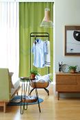 散らかりがちなベッドサイドには、収納かごがついたシンプルなサイドテーブルと、ハンガースタンドですっきりシンプルに。細身のブラックフレームで、シンプルナチュラルなインテリアにも軽やかに調和し、限られたスペースでもコンパクトで機能的に。ブルーの落ち着いた色味の円形ラグや、ラタンであわせたペンダントランプで空間にアクセントをプラス。