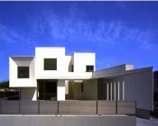 この建物は、小学校が隣接している閑静な住宅街にあります。敷地は3面道路に接していますが東側と南側には建物が建っているため家族のプライバシーをどう守るかが課題の一つでした。南側は道路から建物を離して配置することで内部にも明るい光を取り込む様に、東側は三角形に長く突き出したアプローチの壁が2階建てのアパートからの視線を遮る様に計画しました。