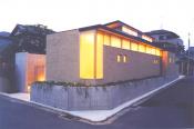 京都の静かな住宅街に建つ住宅。 道路からの高低差を十分に生かし、表情のあるファサードになっている。 窓を高い位置に配置する(ハイサイドウィンドウ)手法によって、建物が道路の近くに建っていてるが、道行く人の気配は感じにくい。 コーナーフィックスの窓が柔らかな光を室内へ取り込む。 中庭と広く接するリビング・ダイニングは、開放的で外部との一体感のある空間となっている。