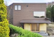 小さい和の雰囲気をつくる低い軒とアースカラーの外壁がアクセントとなる。狭い間口からみても、和を感じさせるファザード。