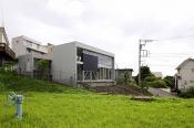 ●傾斜した広い敷地の魅力を存分に楽しむ別荘 千葉県の房総半島に高台にあり、北側に東京湾を望む広い傾斜地に建つ。北側のLDK棟、南側の寝室・浴室棟と、分棟にすることによって、北庭、中庭、南庭と性格の異なる外部空間を生み出している。広い敷地と傾斜地の特徴を存分に楽しむことができる別荘である。 (プロデュース:ザ・ハウス)