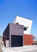 そこに、白い鋭角の箱と、こげ茶の四角い箱の二つを組み合わせ、その繋ぎに赤茶色の木製の縦格子を配置し、その色と形で印象的なデザインを構成しました。