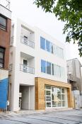 モダンな街並に淡い色の外壁が映える外観