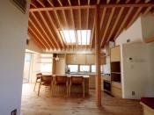 敷地形状から考えた六面体の家で、亀の甲のような形にふたをした様に屋根が架かっています。 内部も角度のついた構成で、変化のある動線や形状が面積以上に広がりを感じます。 南側は3階建ての住宅で塞がれている為 LDKは北側採光と天窓で落ちついた空間になっています。