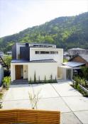 完全分離型の二世帯住宅です。玄関は各世帯別の位置かつ玄関がならばないようにという要望に対して、くの字に曲がる敷地形状を利用して玄関部分のみをずらして配置することで各世帯別の位置、横並びでない配置を実現させて、かつ玄関内の抜け感を作り出しているのが外観の特徴の住宅です。