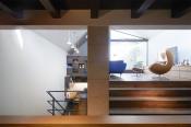 北側道路に面した都市住宅。最上階のリビングは北側(道路側)のハイサイドライトと南側テラスから光が差し込む明るく開かれた空間となっており、それに対して半層下がった北側のダイニングキッチンは、あえて明るさを抑えた落ち着いた空間となっている。上下階が連続する一体空間は床のレベル差と大谷石の壁により緩やかに領域分けされており、窓を抑えることで生まれた明暗がさらにその領域性を強め、光と影は左官、石、木といった素材感を引き立てる。外壁は左官仕上げとしており、様々な土を組み合わせて色味を持たせ、更に大きさの違う砂利を入れて掻き落とす事で質感を増している。左官ならではの弧の表現をデザインに生かし、奥行きを持たせた重厚なファサードデザインをつくり出している。