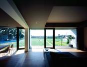 東京23区内とは思えない広大なキャベツ畑の片隅に佇む住宅。3枚のコンクリートの大壁は、両親の育てる青く丸々としたキャベツが緻密に並ぶ広大な畑と、その畑の一角に残る古くからの雑木林の風景を切り取っており、空が高く伸びやかな眺めとなっている。3枚の大壁による単純な空間構成の中に、少しだけガラスの向きに操作を加えることで、空間に動きを与えている。陽が沈み室内にあかりが灯ると、シンプルなその空間構成が夜の畑に浮かびあがる。