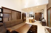 平屋の家は、動線がコンパクトなので、生活がしやすいのが大きなメリットです。 夫婦お二人でのお住まいになるため、部屋数は必要最低限におさえています。 平屋を活かした天井高のリビングは広々としており、シックな色合いの内装に仕上げ、 ご主人様の書斎との間仕切りには、縦格子の扉を用いて、落ち着いた大人の空間を作りました。