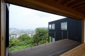 敷地は、緑に覆われた斜面上の土地。遠方に海を望み東側に開けています。斜面の下から覗かれることはないので、東側には眺望を得るための大開口を設けつつ、自らの建物によって隣家からの視線を遮るよう、L字型に建物を配置しました。
