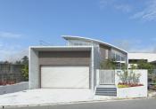 手前に四角いボリュームがビルトイン車庫、その奥からが住宅部分です。四角い箱と、緩やかな曲線を持った箱が重なり建物にリズムを与えています。