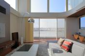 屋根の傾斜が特徴的な3階建てのこの建物は、周囲の街並みに溶け込みつつ印象的な佇まいをしています。前面道路に面して2台分のビルトインガレージを配置してありその上部のバルコニーに高さのある可動ルーバーを設置し、プライバシーを確保しながら採光や景色を自分で調整しながら取り込むことができます。また、建物の中央に中庭的な空間を設けることでさらに光や風をそれぞれの部屋に取り入れることができます。
