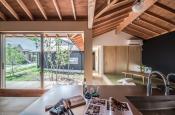 家が庭を囲う中庭の平屋。ロやコの字とは少し違う、少し変形した開放感のある7の字型。 家の形をそのままに、変形した木組みが露出する室内空間。 木材の直線と庭木の有機的な線。うごかないものとうごくもの。家の木と庭の木の交わりが豊かな暮らしを生み出します。