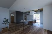 DIYの好きなご夫婦だからこそ、あえてフローリング材を使わず、足場板を床材として使い、造作したテーブルや造作の小物とぴったり合う素材にしています。また、あえて解体した時に出てきた鉄骨の躯体は見せたまま仕上げることで、今後、自由にDIYしていきやすいデザインにしました。極力、設計的には作りこまず、住みながらご夫婦の手が加わることで徐々に空間が完成されていくような空間にしています。