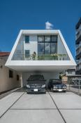 クライアントの要望は前面道路側に4台分(そのうち2台は屋根付き)の駐車スペースを設ける事、2階の天井高の高い開放的なリビングと大きなテラスを設ける事だった。