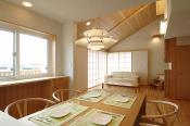 高台の眺めの良い敷地に建つO様邸。周囲には建物が隣接していますが、それを感じさせない開放感と、家からの眺めを考慮した間取りを工夫しました。勾配天井のある開放的なリビングと眺めの良いウッドデッキ。そこは、ゆったりとしたリゾートホテルの一室にいるような居心地です。