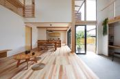 敷地状況の考察より平面計画をL字型とすることで、パブリックとプライバシーを明解に分離した住まいです。パブリックに対して閉じたシンプルな西面エントランスをくぐると、吹抜けの大きな土間のあるリビングとそれを介して見える中庭までの開放的な空間が一気に広がります。また、坂の住宅街を利用した大きな窓からは、遮ることのない広い空の素敵な借景が日々の生活を彩ります。無垢材や漆喰などの自然素材に囲まれた心地良い内部空間は、断熱性能も重視した光と風が通り抜ける居住空間となりました。