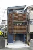 都心の住宅密集地、細長い狭小敷地に建つ木造3階建ての住宅です。
