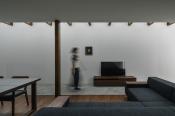 細長い住宅なので長屋の様に通り土間のような用途を共用部に落とし込み、空間を大きく玄関から庭へと続く庭廊(共用部分)とLDK (プライベート部分)に分け、庭廊から各空間へアクセスするような配置にしました。この庭廊の上部に開口をもうけることで日常生活の目線から窓をはずし、プライバシーが確保でき上部から光を落とし込み外のような空間を作り出してくれます。
