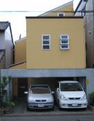 鉄筋コンクリートと木造の混構造の家です。 鉄筋コンクリート部分は明るさと植栽への雨掛りを考慮して床は無く、柱と梁だけできています。鉄筋コンクリート部分の下は2台分の駐車場とし、その上は中2階の子供部屋になっています。